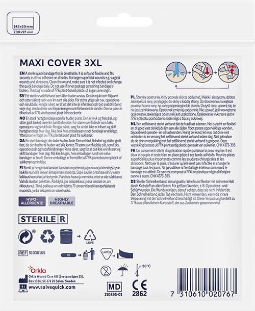 Maxi Cover is a sterile wound dressing that is breathable. This plaster is soft, flexible and fits securely as it has adhesive on all sides. This packaging includes 3 extra large plasters. Do not use if inner package containing plaster is broken.