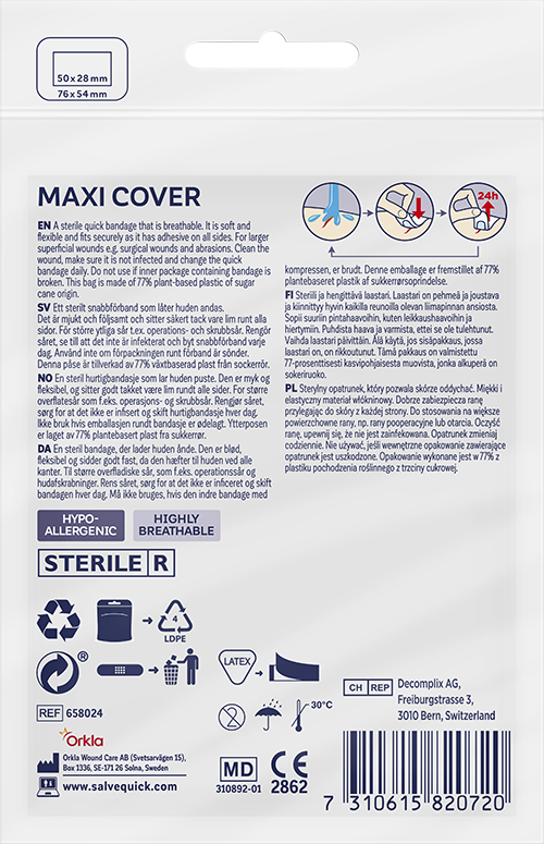 Maxi Cover is a sterile wound dressing that is breathable. This plaster is soft, flexible and fits securely as it has adhesive on all sides.