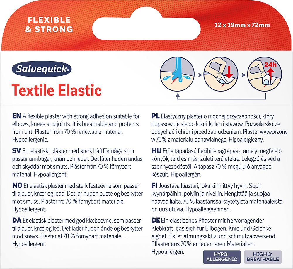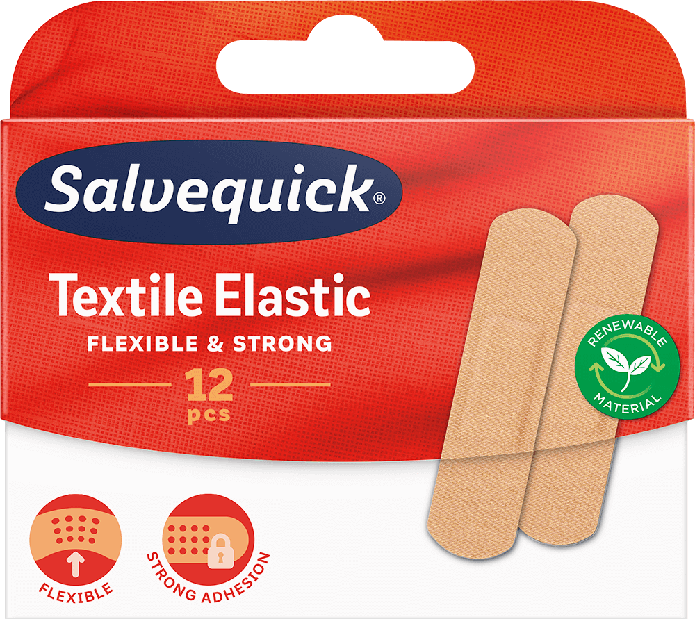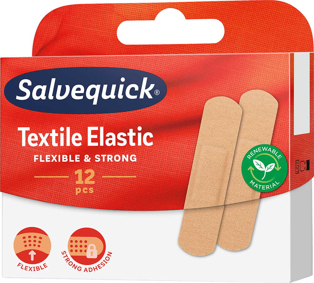 Textile Elastic is a flexible fabric plaster with strong adhesion that’s suitable for elbows, knees, joints and areas with a lot of movement. This breathable textile plaster is dirt-resistant. This packaging includes 12 plasters in one size. The fabric plasters are shaped with rounded corners for better stay-on and made from 70 % renewable material.